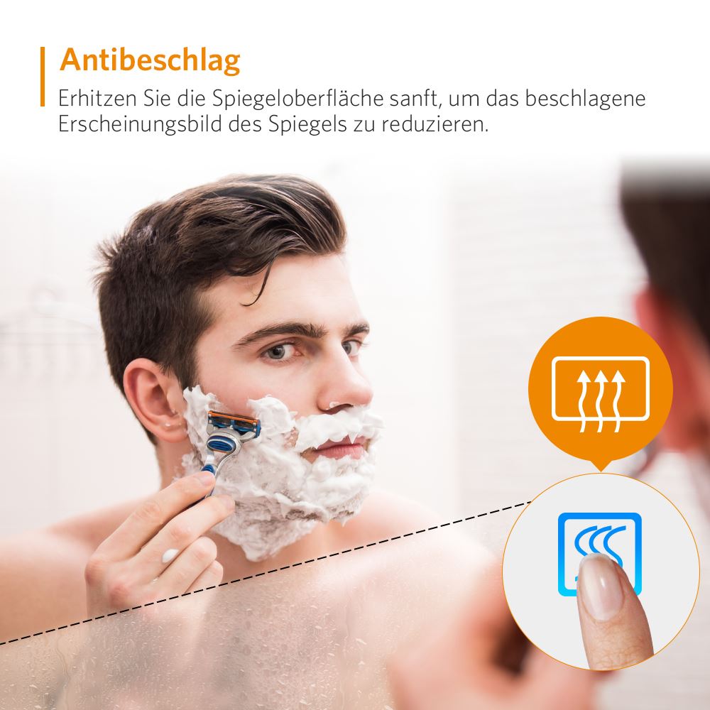 - 【Helligkeit Dimmbar & Antibeschlag】Mit dem Touch Schalter kann man die Helligkeit sich frei dimmen. Kurzer Druck für Ein/Ausschalten, langer Druck für Dimmen.Die volle rechtige Lichtleiste stellen sich genug Helligkeit für Rasieren und Make-Up zur Verfügung. Innerhalb der Tür befindet es sich ein ganzes Demister-Pad. Das Demister-Pad hält den Spiegel immer beschlagfrei, wenn das Badezimmer mit Wasserdampf und Nebel eingefüllt ist.