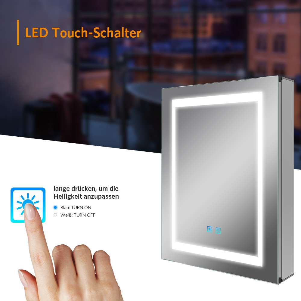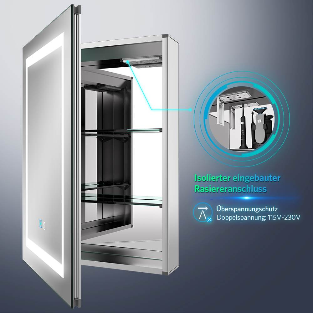 LED Badezimmer Spiegelschrank mit Umgebungslicht Rasier Steckdose Touch-Schalter 50x70cm